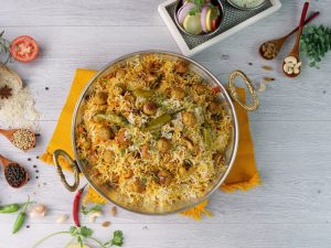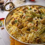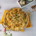 -Add lemon juice,fresh coriander,mint leaves,green chillies,fried nuts,boiled rice,orange food color, biryani essence,mint leaves,fresh coriander,green chillies,fried nuts & clarified butter,cover with kitchen cloth & lid and steam cook on low flame for 12-15 minutes.