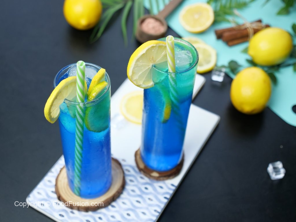 -In a serving glass,add ice cubes,lemon slices,7up,prepared blue curacao syrup (2 tbs) & stir well.