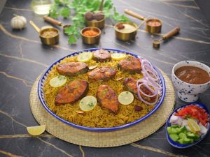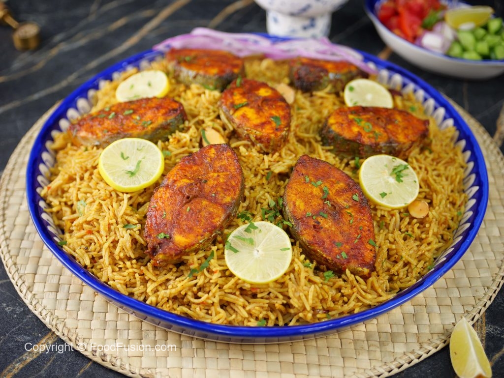-In a serving platter, add mandi rice, baked fish, garnish with lemon slices, give a coal smoke & serve with prepared mandi sauce & salad!