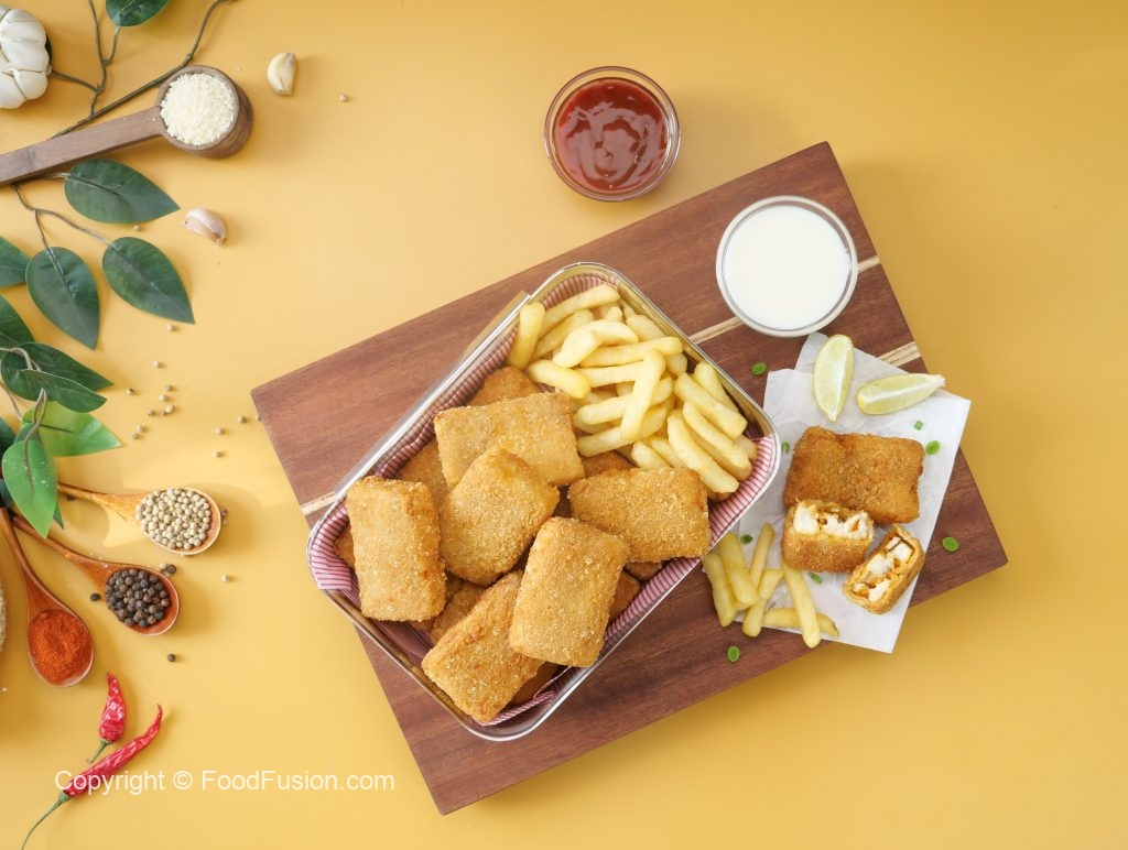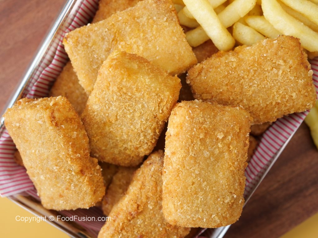 Frozen fish nuggets ko maida mein coat karein phir liquid flour mixture mein dip karein aur breadcrumbs sa coat ker lein (makes 26-28).