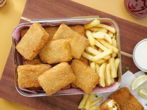 Coat frozen fish nuggets with all-purpose flour than dip into liquid flour mixture & coat with breadcrumbs (makes 26-28).