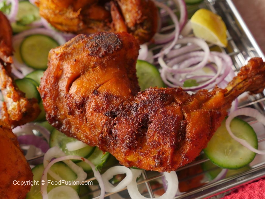 In a wok,add cooking oil,marinated chicken pieces,cover & steam cook on low flame (8-10 minutes each side) then cook on medium flame until water dries up (6-8 minutes).