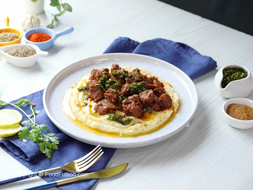 Fry Beef Boti with Mash Potato & Chimichurri Sauce
