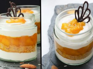 -Chocolate sooper biscuits ko tayyar coffee mixture mein dip karein aur mold ki base per rakh dein.