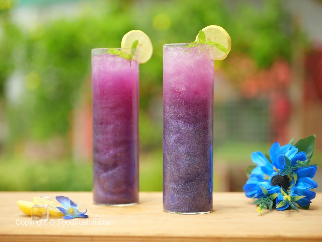 -In a glass,add crushed ice,prepared butterfly pea syrup (3/4 cup),edible silver glitter & mix well.
