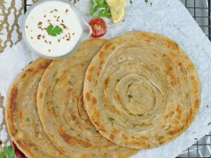 -Heat griddle,place paratha,add clarified butter & fry on low flame from both sides until golden (makes 8).