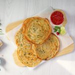 -Ghee dal ker pheela lein,dry flour sprinkle karen,phir strips cut karen,hara pyaz leaves sprinkle karen aur 4 strips ko swiss roll ki tarah roll karen (beech beech mein stretch karen).