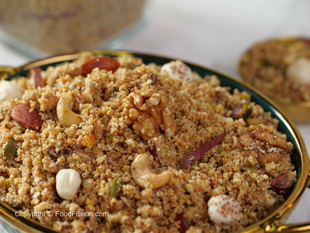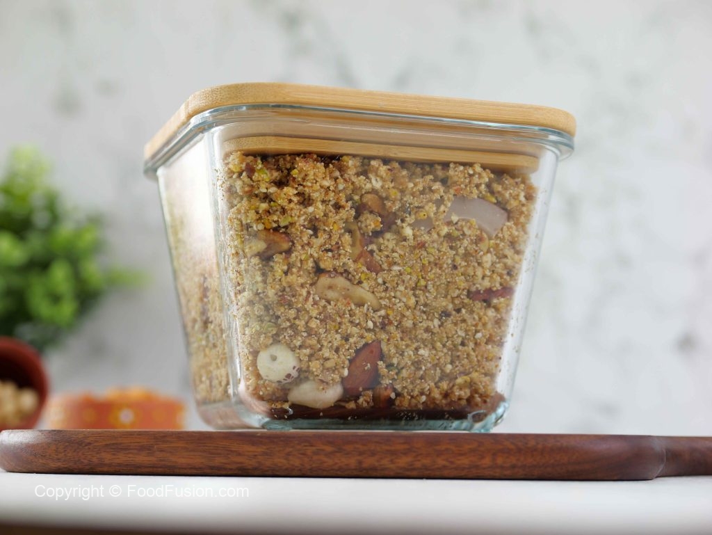 -Chopper mein roasted lotus seeds aur fried edible gum add karein, coarsely chop kar ke bowl me transfer karein.