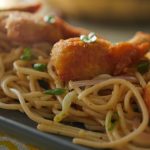 Serve Hakka noodles with fried shrimps and sprinkle spring onion green for garnishing.