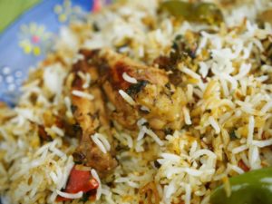 For biryani layering,add chaat masala,whole spice powder,yogurt,mint leaves,green coriander,fried onion,tomatoes,green chilies,boiled rice,fried onion,green coriander,mint leaves,tomatoes,kewra essence and oil.