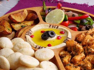 -Serve lemon herb chicken with hummus, prepared balsamic tomato cucumber salad, potato wedges & pita bites!