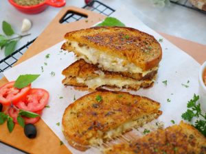-Take two sourdough bread slices & apply prepared herbed butter on both sides of them.