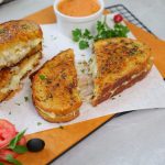 -Ek bread slice per cheddar cheese slices,mozzarella cheese,tayyar beef filling aur mozzarella cheese dal ker dosra bread slice rakh dein.