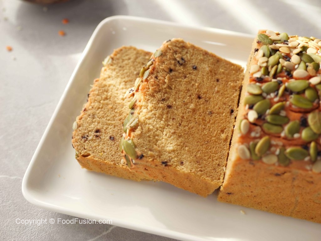 -Pour batter in 8x4 inches bread mould (greased & lined with baking paper),spread evenly & tap few times.