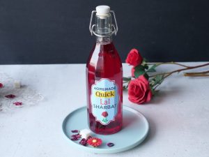 -In a serving glass,add ice cubes,basil seeds,water,lal sharbat and stir.