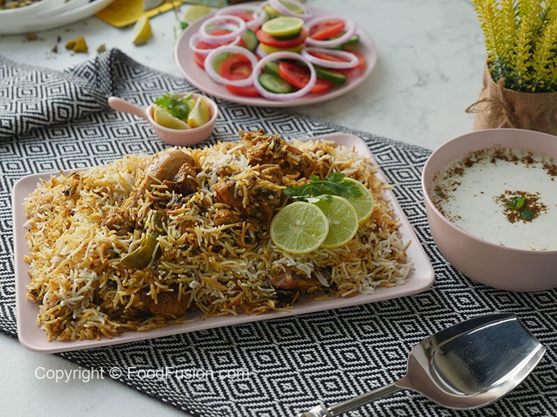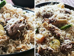 Add mint leaves,boiled rice,remaining prepared spice mix,fried onion,remaining boiled rice and ghee,cover & cook on high flame to build up the steam (4-5 minutes) then turn flame to low and steam cook for 25-30 minutes.