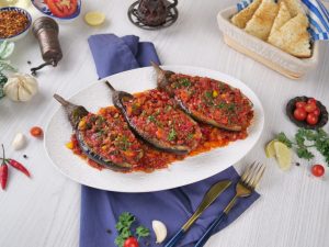 -Peel eggplants alternatively from the skin lengthways & prick with fork (don’t remove the head).