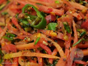 In bowl,add oil,nigella seeds(crushed),mustard seeds (crushed),coriander seeds(crushed),salt,red chili flakes,fennel seeds (crushed),tarti,garlic paste,green garlic,green chili and carrots.