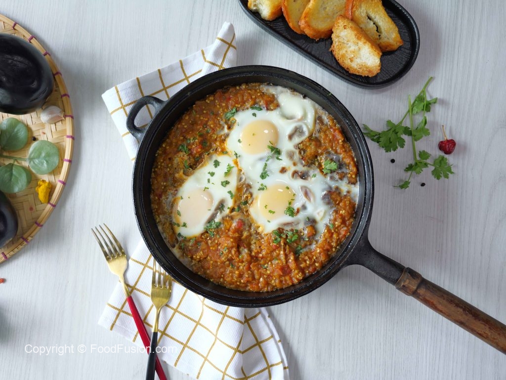 -Insert skewer & fire roast eggplant over medium flame until skin is charred,remove charred skin,chop well & set aside.