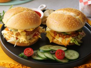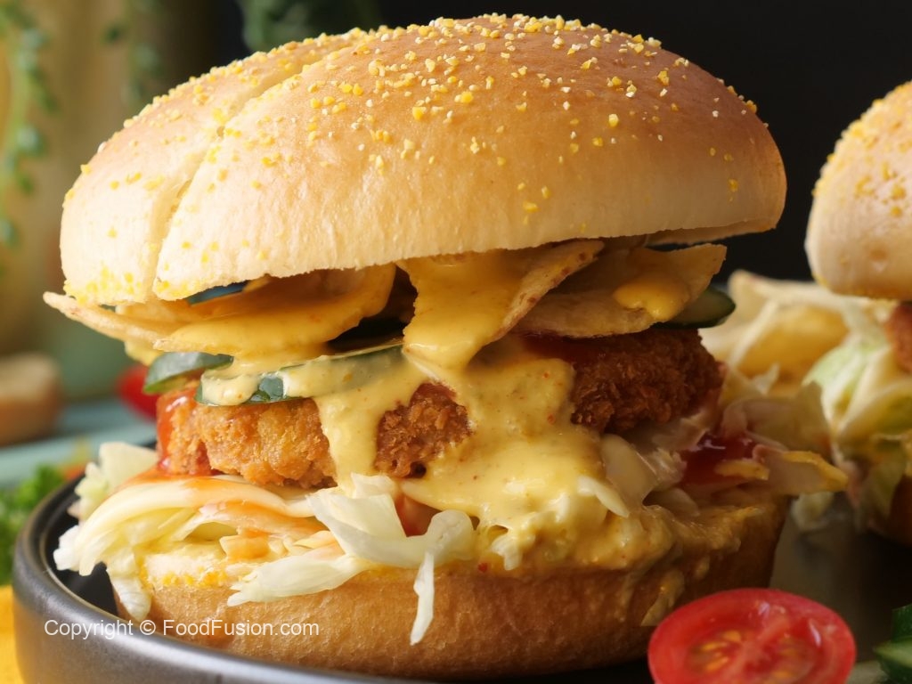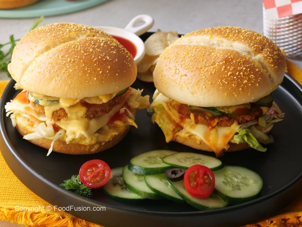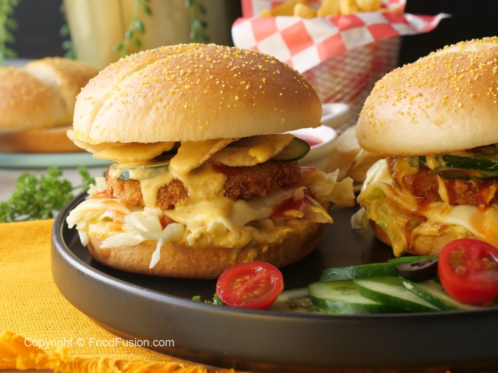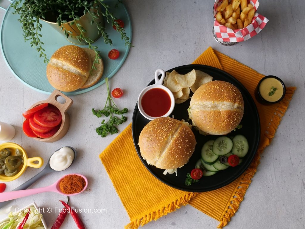 -On a burger bun,add & spread prepared jalapeno mayo sauce,add iceberg,cheese slice,fried veggie burger patty,tomato ketchup,cucumber,bakery chips,prepared jalapeno mayo sauce & cover with top burger bun (makes 4) & serve!