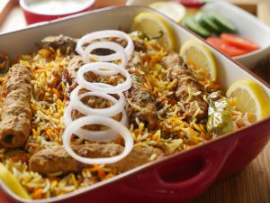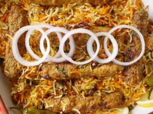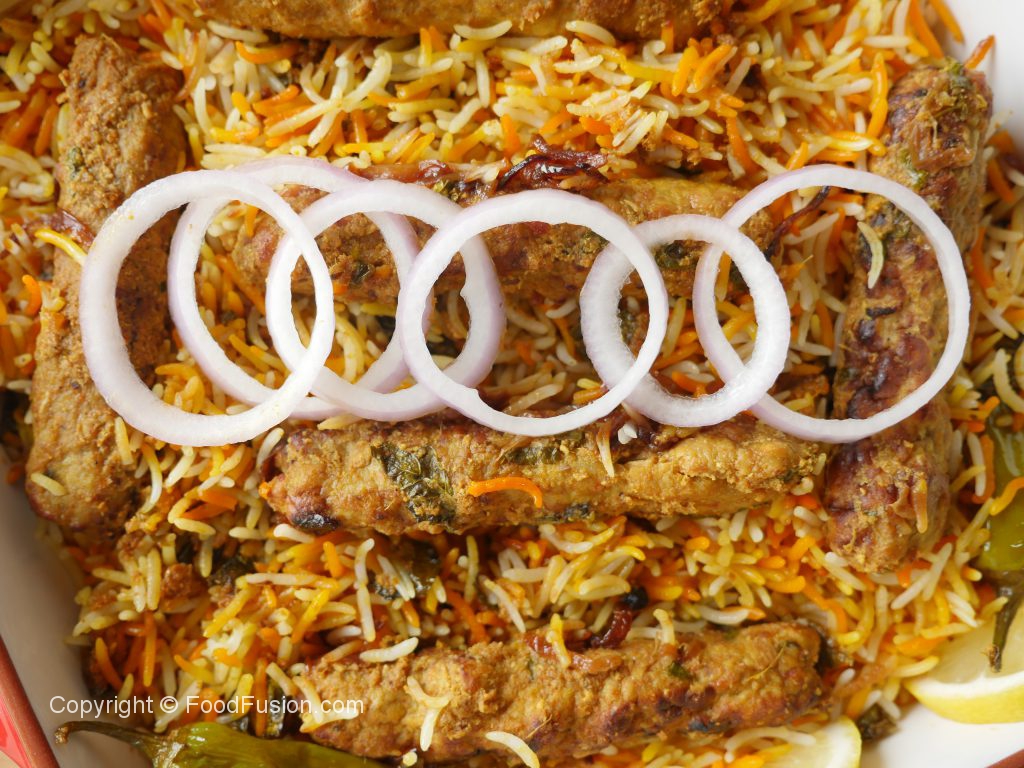 Ab dissolve zarda ka rang,fried pyaz aur cooked seekh kabab dal dein.