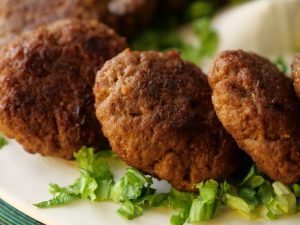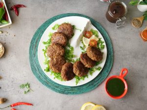 -Grease hands with oil,take a small quantity of mixture (50g),make a ball & flatten on your palm,add prepared filling,cover properly & make kebabs of equal sizes (makes 11-12).