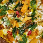 -In a serving dish,add phulkiyan,prepared dahi mixture,prepared khattay aloo,dahi mixture,green chutney,prepared tarka,papri & serve!