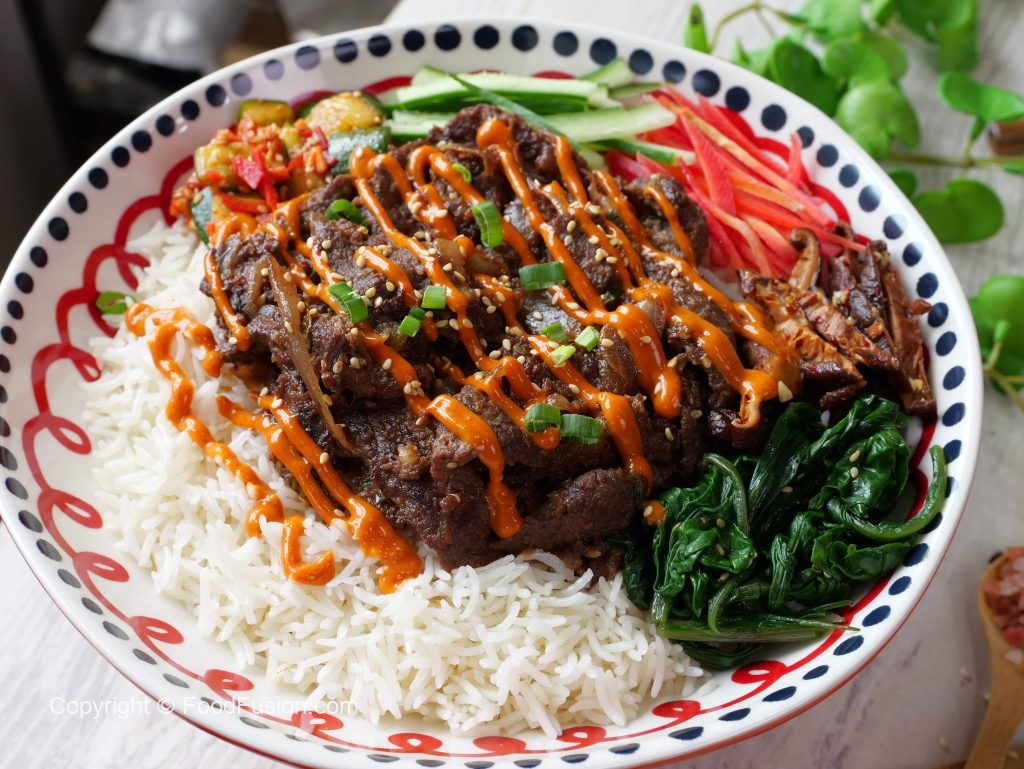 -Ek serving bowl mein cooked rice dalen, upar se beef bulgogi, steamed spinach, stir fried shiitake mushrooms, carrots, cucumber aur kimchi rakhen.