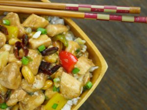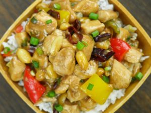 In a wok, add oil and saute dried red chilies, ginger, garlic. Add white part of green onion and bell pepper, saute and add chicken and sauce.