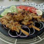 Marinated chicken ko wooden skewers per laga lein (makes 9-10).