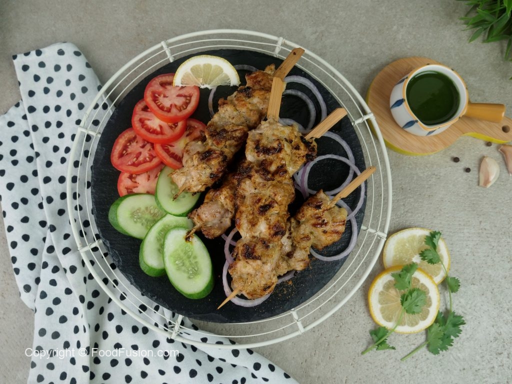 Grease cast iron grill pan with cooking oil & fry skewers from all sides until golden brown.