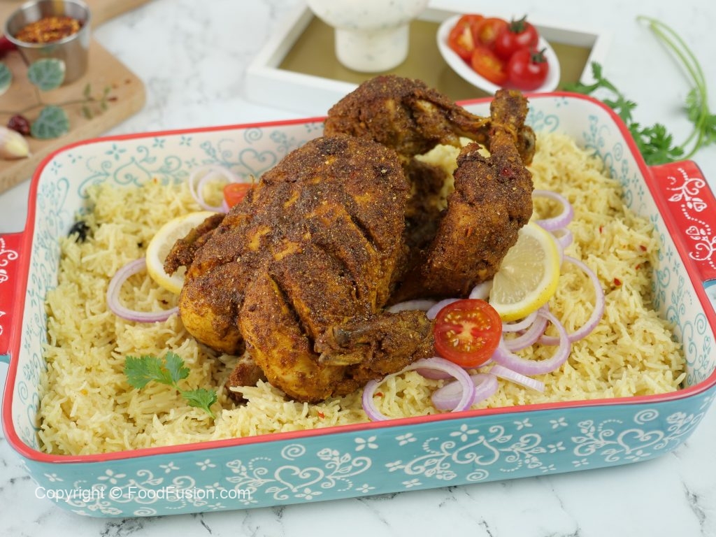 -Chulha bund ker dein aur whole chicken per tayyar spice mix chirak dein.