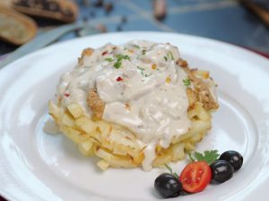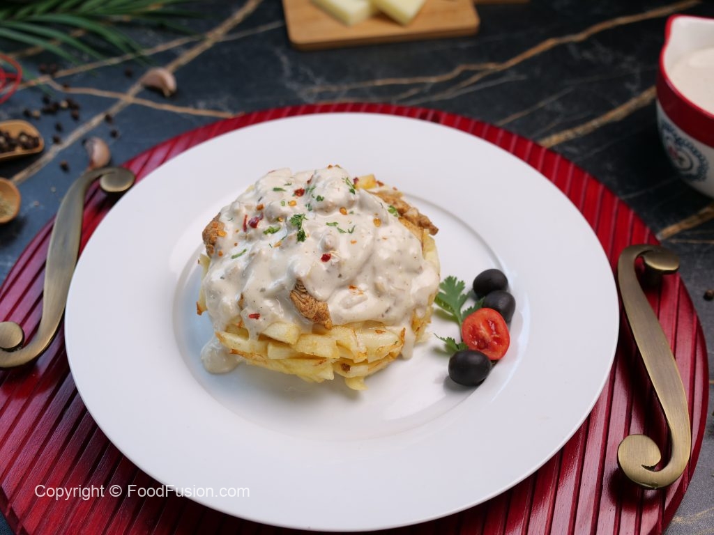 -In baking pan,add potato fries,creamy alfredo sauce,mozzarella cheese,potato fries,mozzarella cheese,red chilli crushed & fresh parsley.