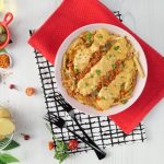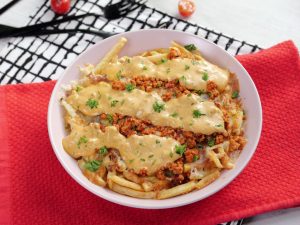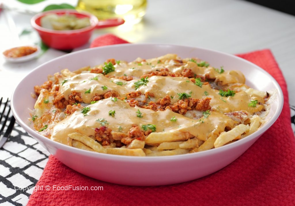 -On a serving dish,add potato fries,prepared hot chicken filling,caramelized onion,cheddar cheese, mozzarella cheese & air fry at 180°C until cheese melts (3-4 minutes).