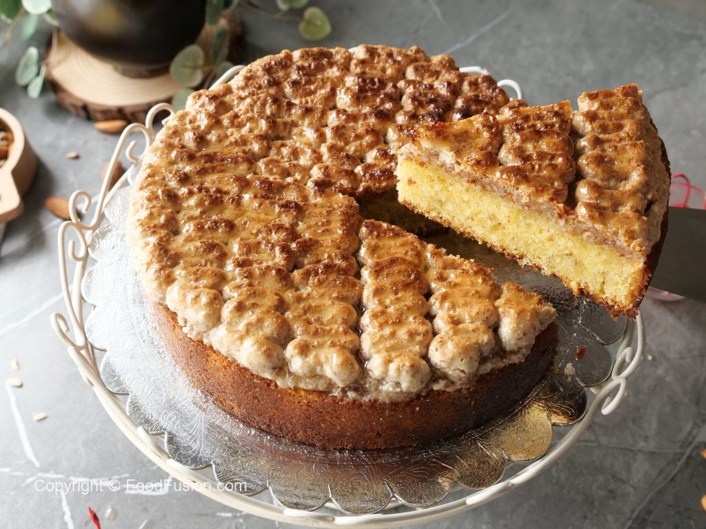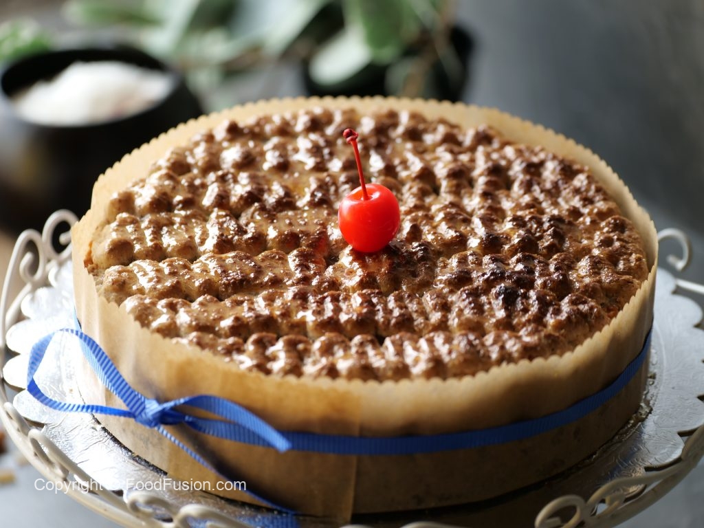 -Spread a layer of prepared macaroon topping then make a line of wavy design and bake again in preheated oven at 130C for 20-22 minutes (turn on top grill only).