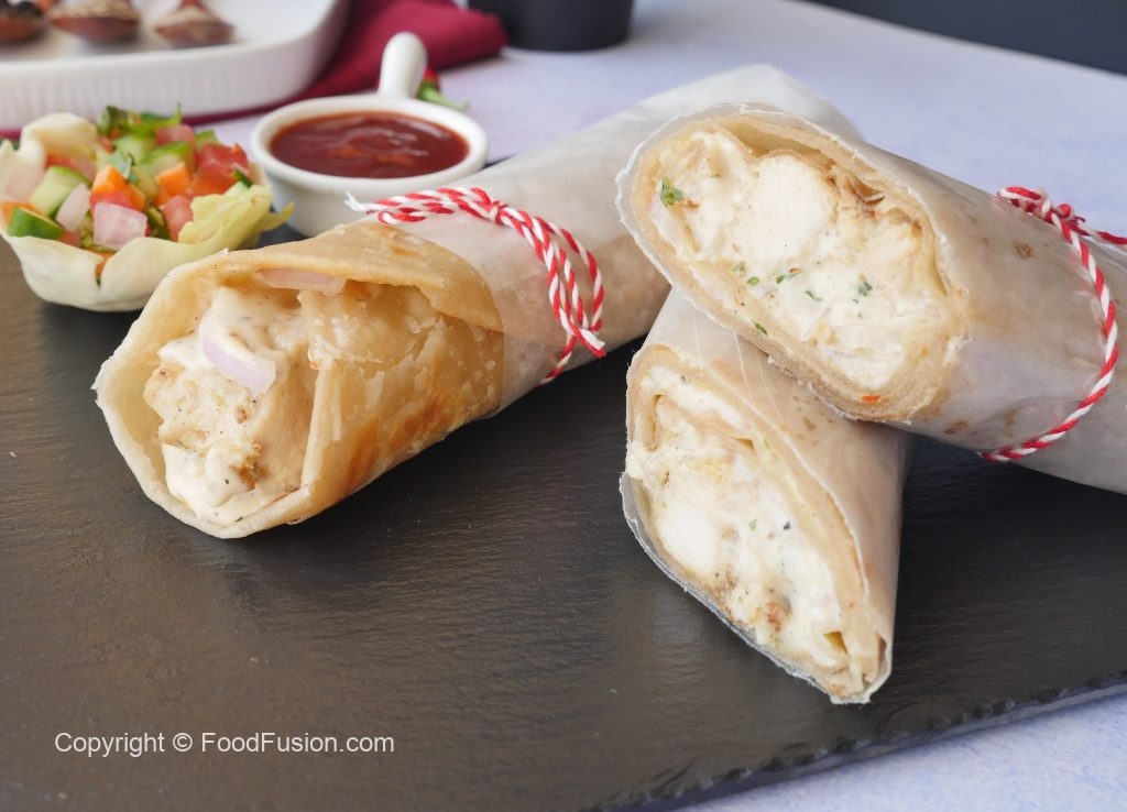 Paratha per tayyar creamy white sauce,chicken malai boti,pyaz aur creamy white sauce dal dein aur roll ki tarhan fold karein aur butter paper mein wrap ker ka serve karein! (Makes 4).