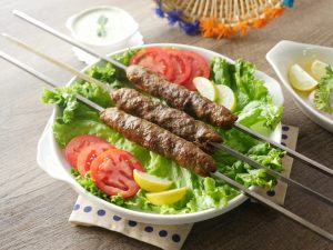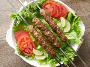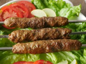 Grease hands with oil,take a mixture and make kababs of equal sizes on metal skewers. (makes 10-12).