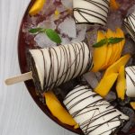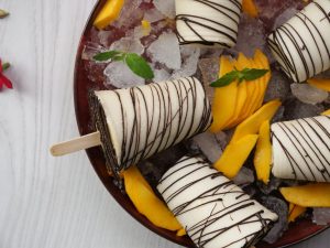 -Pour melted white chocolate in plastic disposable cups/Kulfi molds & tilt the cup to spread inside evenly then remove excess & let it set in refrigerator for 15 minutes then repeat chocolate coating,remove excess & refrigerate until set.