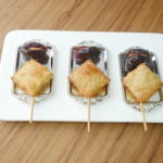 Take samosa sheet and cut into four equal parts/strips,place one samosa patti/strip horizontally,apply all-purpose flour paste,place skewer/stick then place second samosa patti vertically over first one,it will make plus (+) sign.