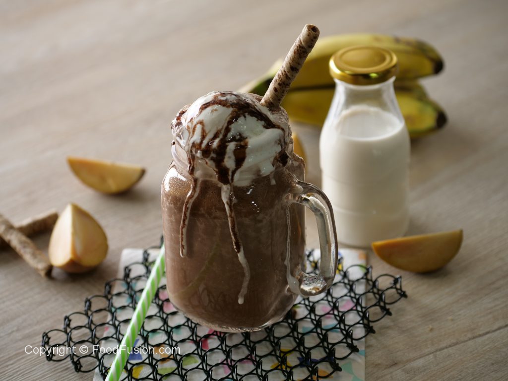 Blender mein banana,chikoo,cheeni,cocoa powder,vanilla ice cream,ice cubes aur doodh dal ker ache tarhan blend ker lein.