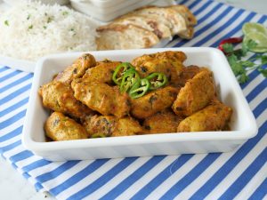 -In a chopper,add chicken,onion,green chillies,fresh coriander,gram flour,Kashmiri red chilli powder, coriander seeds,salt,cumin seeds,red chilli crushed & lemon juice,chop until well combined & refrigerate for 30 minutes.
