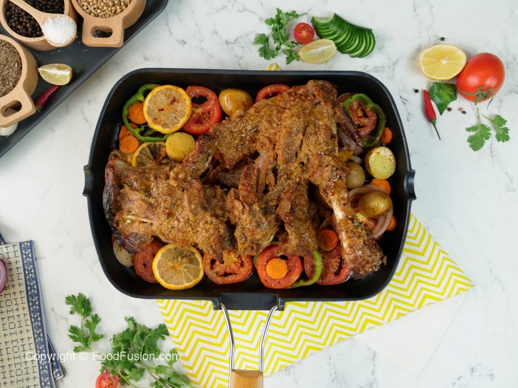 Place extra thick parchment paper & marinated leg,cover & steam cook on low flame until tender (1 hour).