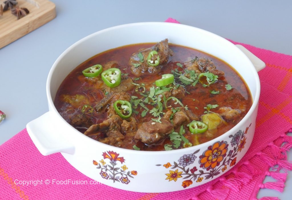 Pani dal ker ubal anay dein aur dhak ker halki ancch per gosht gul janay tak paka lein (35-45 minutes) phir tez ancch per oil alag hunay tak paka lein.