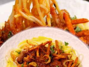 In frying pan,add oil and add marinated chicken,cook until chicken is done,set aside.