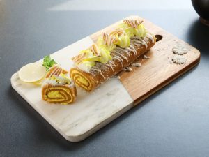 -Trim edges,add & spread prepared filling & roll out dough sheet into a Swiss roll shape & refrigerate for 30 minutes.