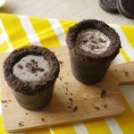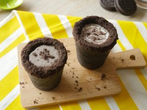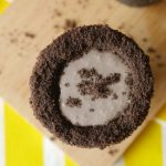 Oreo shots ko molds mein sa nikal lein aur oreo shots glasses ki rims ko cream mein dip ker ka crumbled oreo biscuits mein coat ker lein.