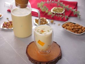 -In a grinder,add fried onion,desiccated coconut,almonds,mace,coriander seeds,fennel seeds,dried ginger powder,saffron strands,milk & grind well to make a thick paste & set aside.