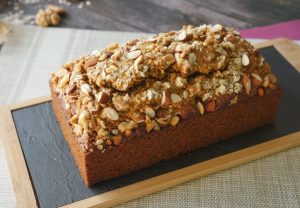 Pour prepared batter in greased loaf pan,sprinkle instant oats,almonds & walnuts.