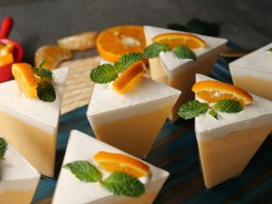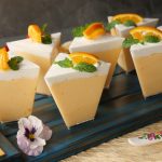 In serving cups,add a layer of orange mousse,whipped cream and scrape excess cream.