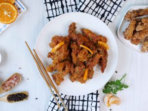 -In a wok,add lemon & orange juice (1 Cup),brown sugar,remaining spice mix (1 tbs),lemon zest (1/4 tsp),orange zest (1 tsp),cornflour & whisk well.